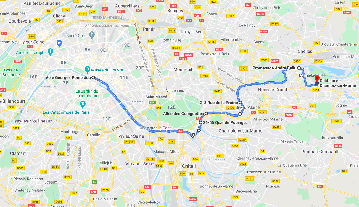 C’est ici qu’on vous quitte. Pour le retour, deux options : si vous êtes motivés, repartez en sens inverse jusqu’à Paris. On dit qu’on ne voit pas le même paysage dans un sens et dans l’autre. Si vous êtes à plat, vous pouvez toujours rejoindre le RER A (station Noisiel le Luzard). Vous serez de retour à Paris en 30 minutes. Et on ne vous en voudra pas, promis.