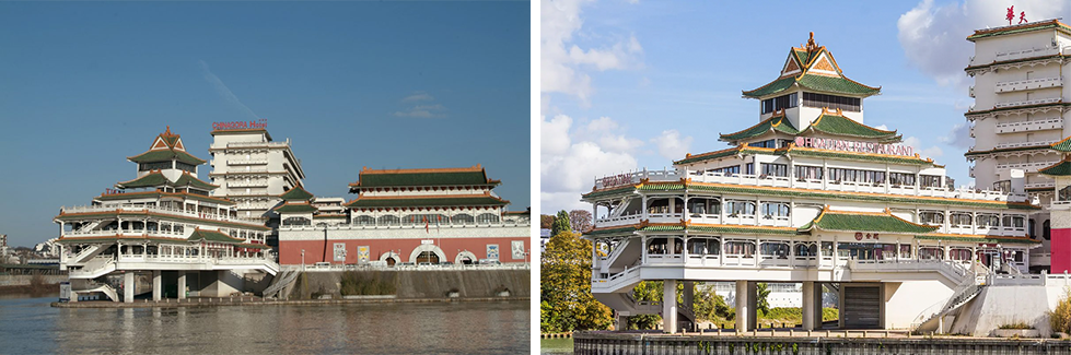 Vous pédalez alors le long de la rivière et le paysage se verdit - des arbres, youpi ! Là, le premier qui voit le pavillon chinois a gagné. Vous verrez, vous ne pouvez pas le louper. Et si vous vous demandez ce que ce complexe aux airs de palais fantôme fait là : il s’agit de l’hôtel Chinagora qui est inspiré de la Cité Interdite de Pékin et du Palais impérial chinois - en toute simplicité.