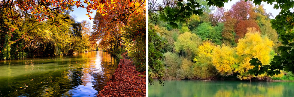 Oui, c’est une route bétonnée. Oui, c’était le PIRE passage de toute la balade. C’est fini. Là, normalement, vous voyez de l’eau et cette eau s’appelle la Marne. Bravo. A partir de là, tout devient très simple : vous traversez le pont, vous descendez sur l’autre rive - direction Château de Champs-sur-Marne - et vous n’avez plus qu'à longer la Marne, ses jolies maisons, ses péniches… et vous émerveiller devant ses magnifiques couleurs d’automne.
