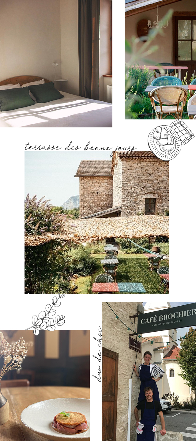 Ça peut sonner cliché, des p'tits jeunes qui s'installent dans un patelin. Sauf qu'un cliché, ça se travaille et de ce côté-là, Valentine et Thomas ont assuré. Quand lui n'est pas en cuisine et qu'elle ne vadrouille pas entre les tables, ils partent tous les deux à la rencontre des artisans du coin : il y a le bleu du Vercors-Sassenage, les truites charnues d'Echevis, les p'tites mousses bien fraîches de la brasserie du Col de la Machine... Les assiettes changent au gré des saisons et des rencontres. À l'étage, 3 petites chambres attendent les randonneurs. Car pour 10€, Valentine et Thomas vous préparent un panier pique-nique à emporter tout là-haut dans les sommets. Repérez bien le chemin, il faudra être rentré pour le coucher de soleil. Il se savoure depuis le jardin perché du Café Brochier.