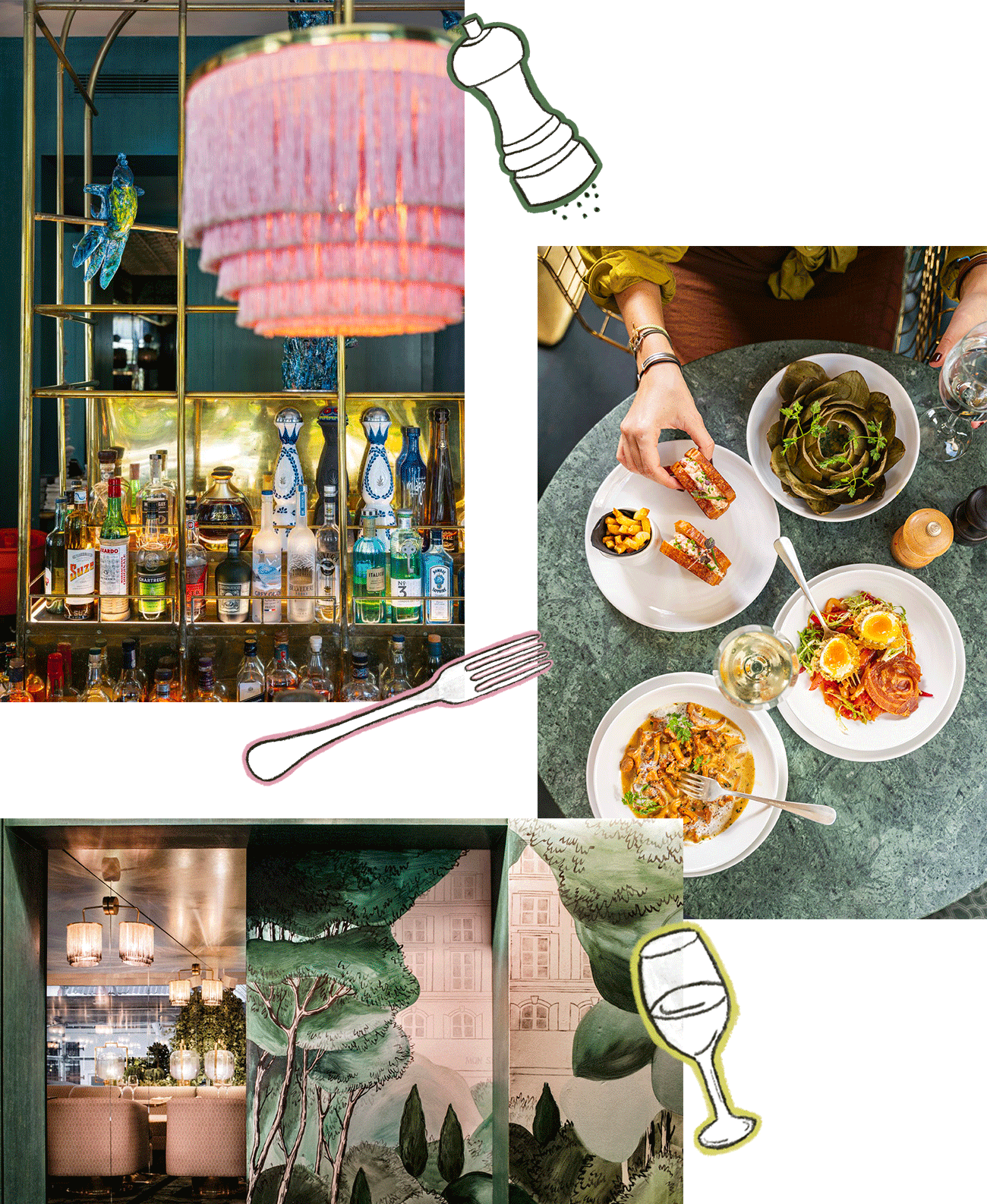 Une fresque végétale prolonge le square entre les murs du restaurant. Elle rosit dans un recoin imaginé pour les tête-à-têtes. Puis elle disparaît au profit des miroirs de la mystérieuse « kiss room ». Dans l’entrée, le bar se prend pour une cage aux oiseaux géante et envoie tous les jours des cocktails shakés par la créative Olivia. Oui, même le dimanche. Pas de blues qui tienne quand défilent dans l’assiette un tarama flying fish relevé de petites billes de wasabi, un croque à la truffe de bon aloi, un saumon laqué cuit avec précaution, dans un four spécifiquement conçu pour lui, et enfin un « air brownie » à tomber de légèreté, avec son nuage de chocolat blanc vanillé et son cœur caramel.