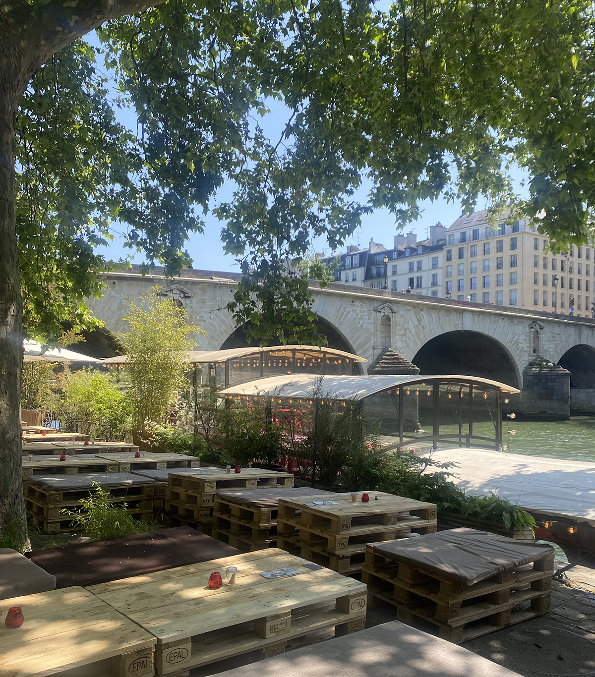 D'où que vous soyez sur cette terrasse, la vue est grandiose : au choix le pont Marie, l'Ile Saint-Louis, la Seine ondulante, un saule pleureur, ou bien les quais, qui se transforment le soir en piste de danse.